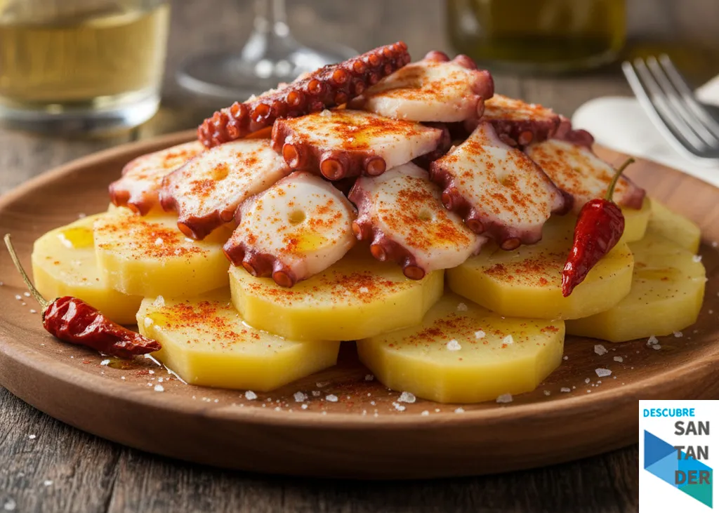3 Dispón las patatas y el pulpo. Coloca las patatas cocidas en un plato grande. Corta el pulpo en rodajas y colócalo encima de las patatas.